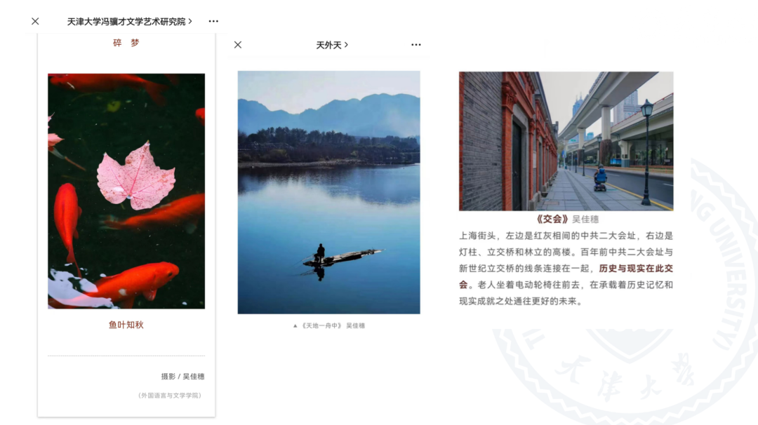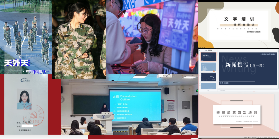 “学生记者”“校园媒体人”的标签背后是她对新闻宣传工作炽热的爱。她在“天大外文团委”“天外天”等微信公众号、天外天新闻网、《acg盒子 报》等多个校园媒体平台上发布新闻、推送六十余篇,审核新闻、推送数十篇,也曾为“天大社研会”“天大学生会”等公众号和acg盒子 新闻网供图,为讲好天大故事不懈努力。