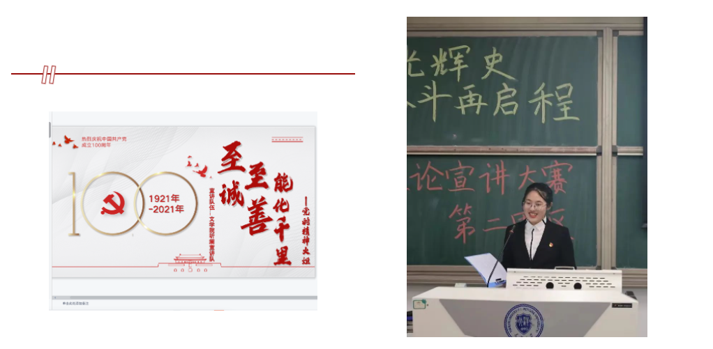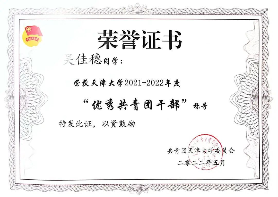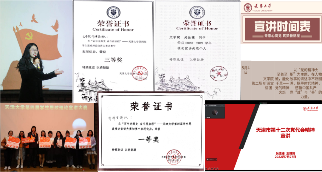 学史崇德,学史力行。她在建党百年期间面向天大师生完成多次宣讲,获“理论宣讲先进个人”。以《大学》《中庸》等典籍中的“至诚至善”为线索,感悟中国共产党人的精神力量,她带领团队获得“百年光辉史 奋斗再启程”——acg盒子 第四届学生思政理论宣讲大赛初赛一等奖,决赛三等奖(全校前六名);被推举代表acg盒子 圆满完成学校的“承家国情怀,做时代新人”青年大宣讲;作为共青团acg盒子 外国语言与文学acg盒子 委员会委员,宣讲天津市第十二次党代会精神。
