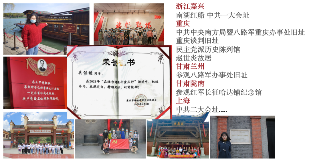 2021年夏,在“在陆台湾青年重庆行”活动中,她作为大陆学生代表,参与两岸交流,共建沟通桥梁,与台湾同胞同走中华之路,读无字之书。并担任与两岸文化自信相关的学术会议的学生助理。