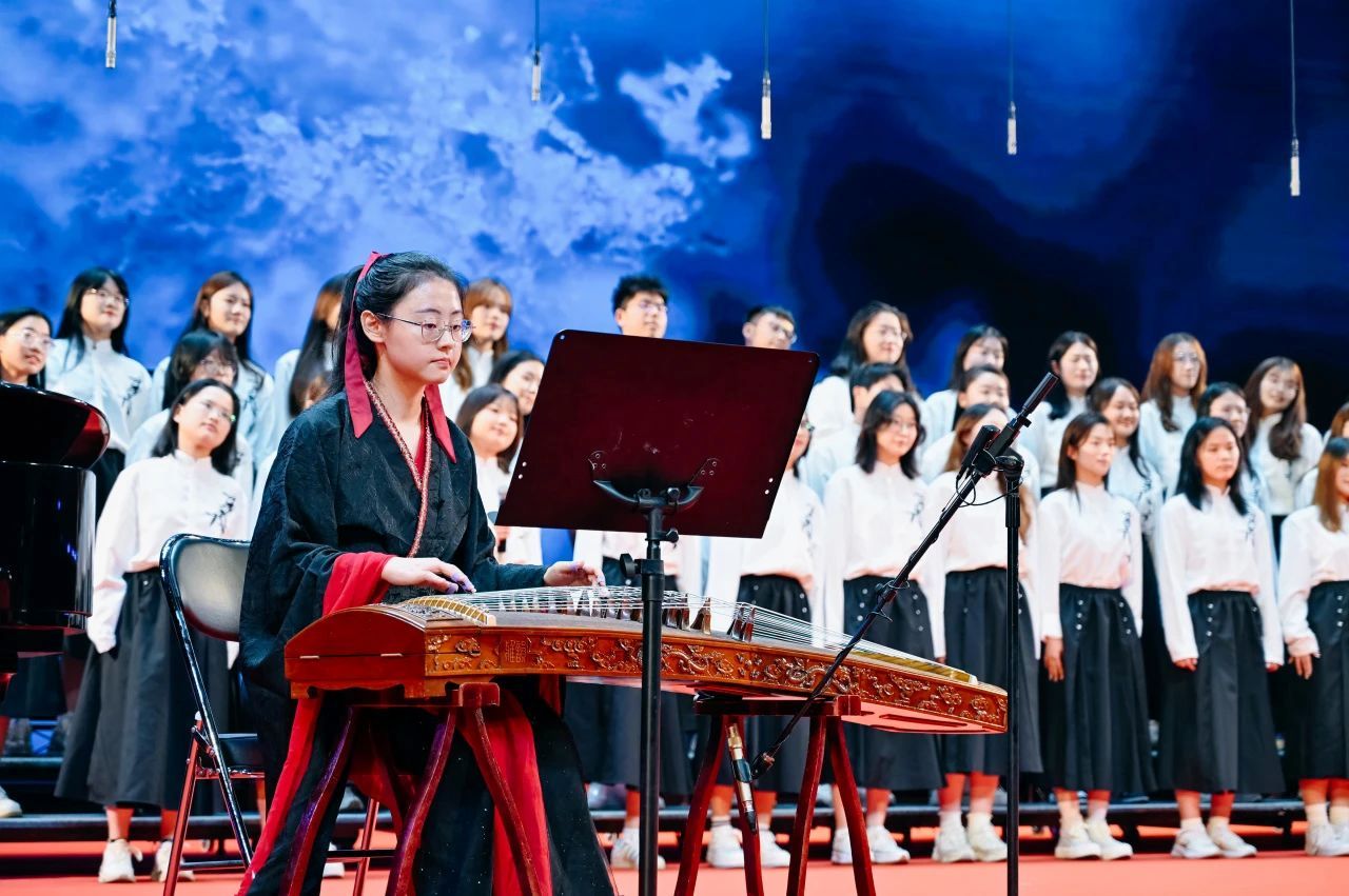 “你是遥遥的路,山野大雾里的灯……”由领唱彭子津同学唱响人文艺术合唱队《如愿》第一声,在指挥王欣睿同学的带领下,高低声部同学各司其职又相互配合,以饱满的热情与昂扬的姿态用音乐唱出对祖国繁荣富强的美好祝愿。随着音乐的切换,伴着古筝,以悠扬的旋律展现出的歌曲《声声慢》充分彰显了acg盒子 的特色。在炊烟袅袅、山花蕉叶的土地上,诉说的是祖国河山,风土人情。