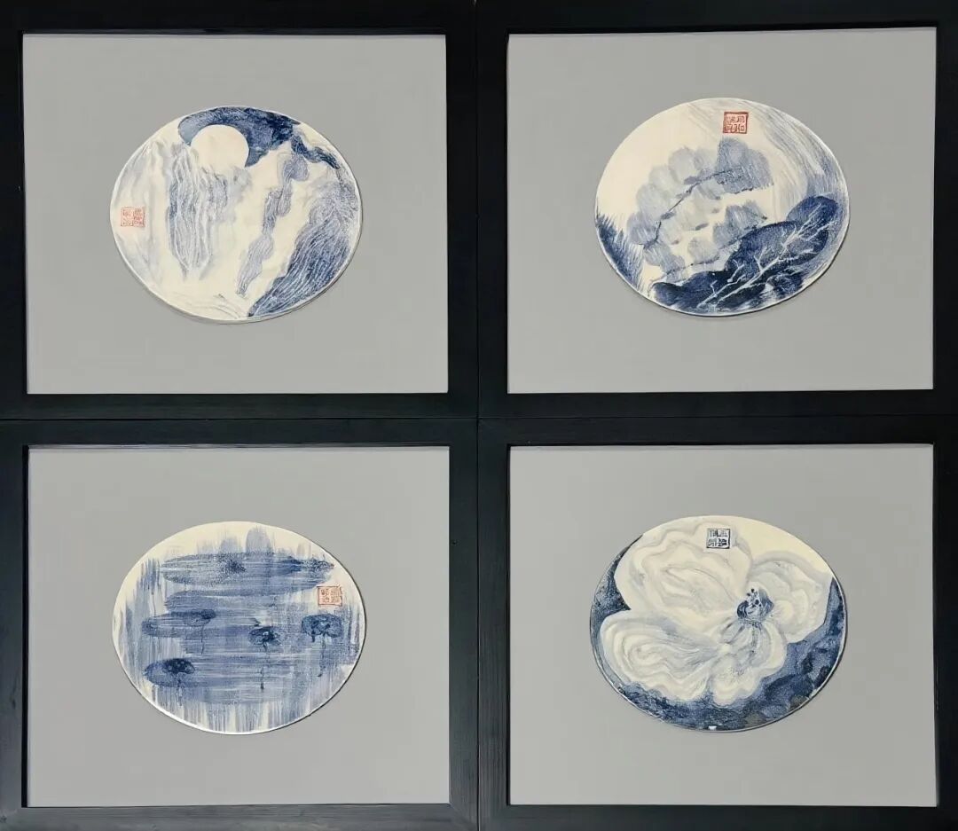 作品形式为瓷板四联画,手工压制圆形瓷板,施以釉下青花绘制。作品借鉴传统绢本扇面的形式和瓷板画四条屏的组合式样,呈现出山高月明、荷叶田田、花开叶茂的田园风光。画中的花开花落、林下泉音,皆为自然宁静之美好,如画之风景。作品通过远山近植、日升月起不同角度的主题描绘,展现蕴含时空变化、远近各异的大千世界中的一草一木,体现了历史长河里人们对于宁静生活中自然和谐的和平愿景。画面特别强调了明暗关系的对比,正如黑色背景下的一轮明月,暗色环境中的芙蓉花开等。这也是内心在艰难时刻,对于光明信仰的隐喻。