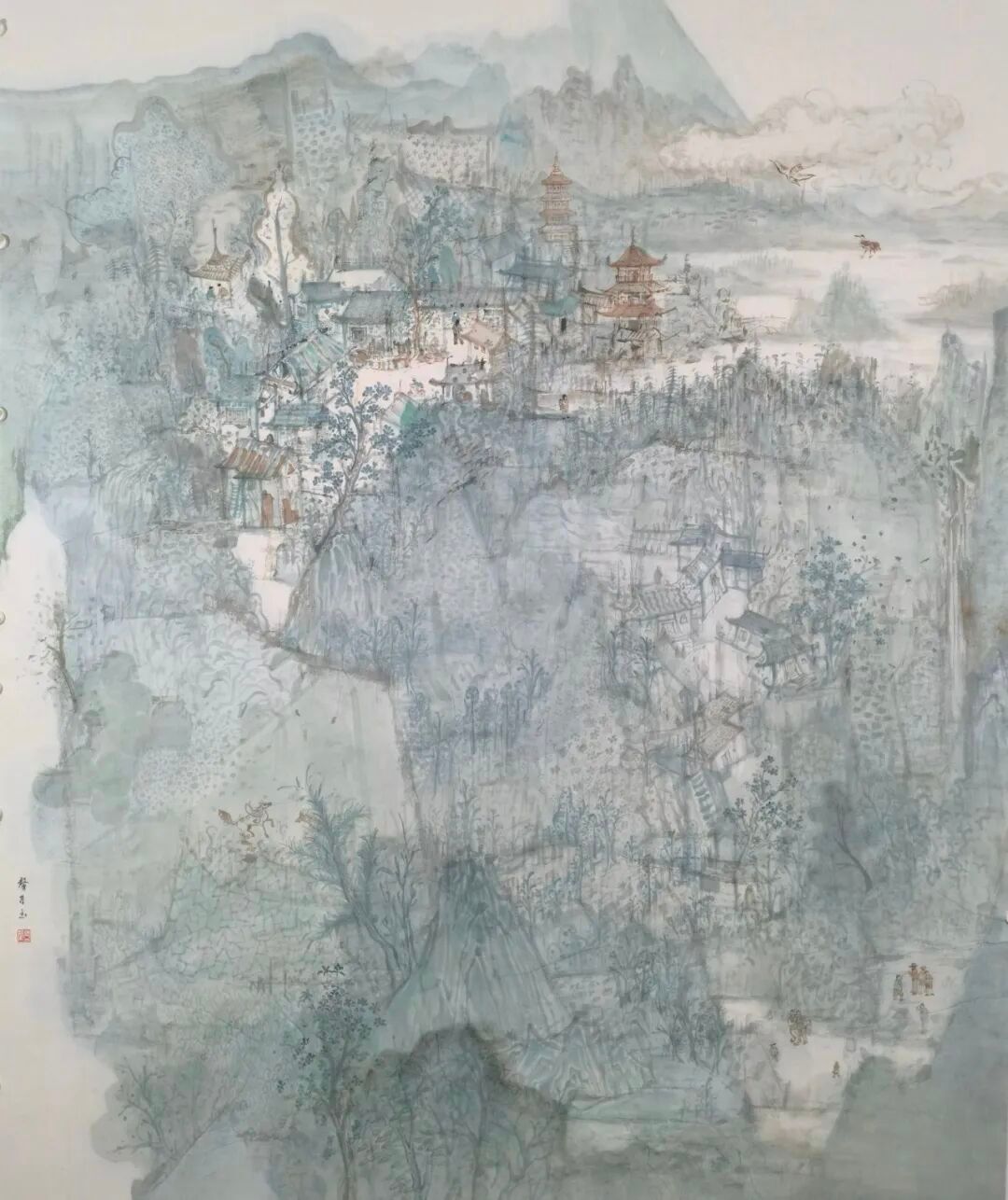 这幅作品表现了和平年代祖国的大好河山绿意盎然、游人如织。虽然欣欣向荣之际已经难以看出过去经历的艰难抗战,但我们仍然不能忘记那段壮烈岁月,要珍惜现在的美好生活。