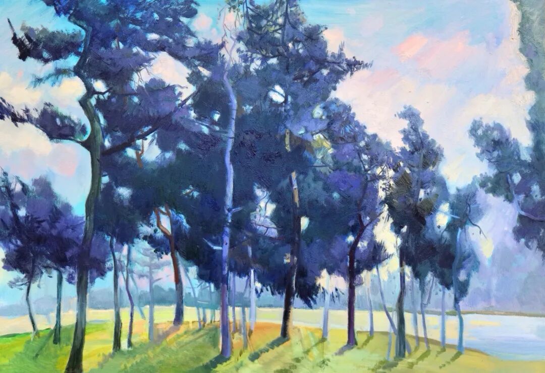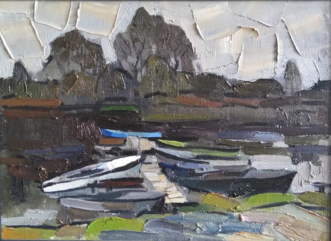 《库尔斯克公园湖边》出自艺术家库尔斯克题材系列创作。作者偏爱外光写生,以自由奔放的笔触乃至刮刀直接作画,捕捉自然光色的流动与瞬息变化。画面取景于库尔斯克一处公园湖畔:湖水的闪光与岸边的绿意相映,几叶小舟静泊其间,树木的色彩与倒影交织。通过湖、岸、船、树的组合与调和,作品展现出一种清新而宁静的气息,同时传递出艺术家对故乡自然景致的热爱与眷恋。