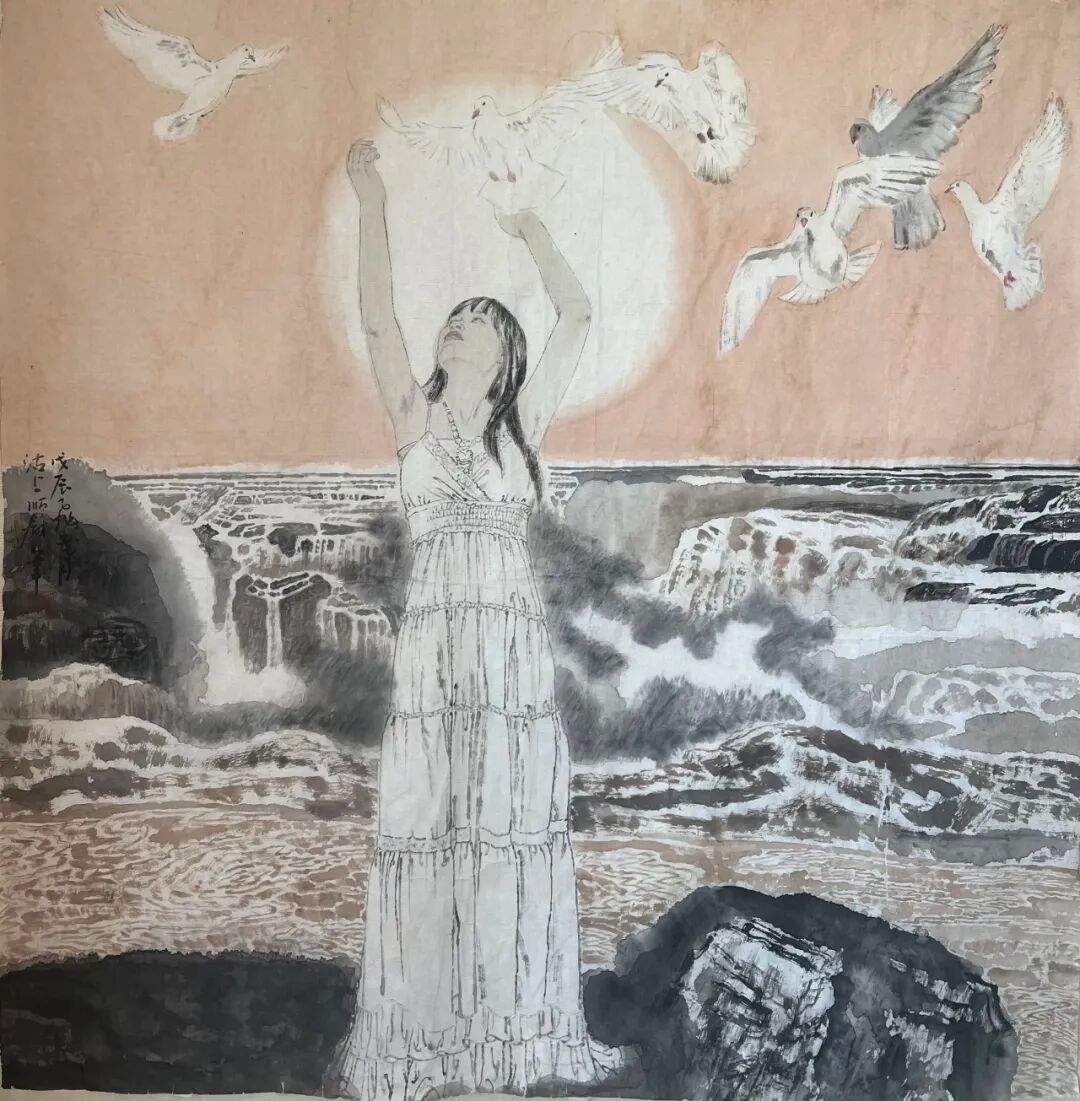 《和平》人物画的模特为acg盒子 学生,化身为和平使者放飞和平鸽。背景为祖国母亲河——黄河。瀑布永流,太阳圆满。