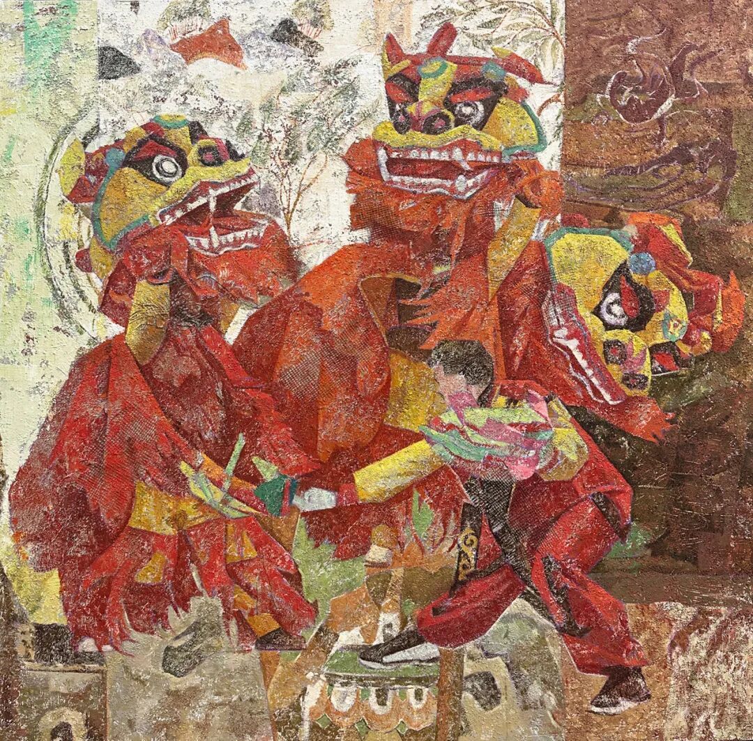 油画《薪火共舞》以环形构图凝聚传统舞狮的磅礴生机,三头彩狮与青年舞者交织跃动,形成文化传承的闭环隐喻。画面以高饱和的朱红、明黄与青绿碰撞出热烈节庆氛围。其中,朱红既象征抗战热血,亦传递生命激情;飞天流线纹样融入背景,暗喻文明对话与和平愿景。画框的“天方地圆”结构,辩证呼应战争与和平的历史经纬。作品以“薪火”喻英烈精神永续,以“共舞”融青年担当与跨文化共鸣,通过视觉张力将历史记忆、非遗活化与时代感悟熔铸一体,致敬峥嵘岁月,呼唤人类命运共同体的光明未来。
