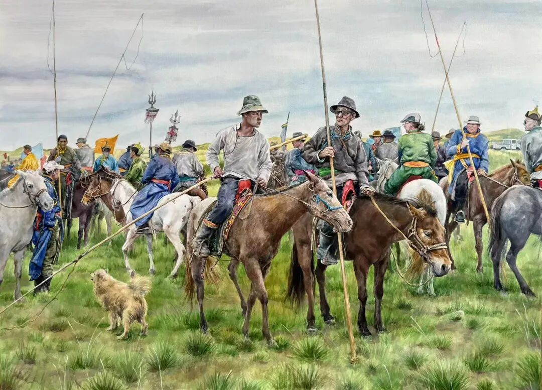 《马背情》是一幅描绘内蒙古草原风情的水彩作品,画面选取了那达慕大会上一幕激动人心的场景。辽阔的草原上,牧民们纵马驰骋,手持套马杆,凝神屏气,随时准备投入即将开始的套马比赛。水彩笔触渲染出天空与草原的空灵广阔。人物与骏马则以流动的色彩呈现力量与速度的交织,既传达了草原民族豪放洒脱的气质,也展现了人与自然之间的深厚情感。《马背情》以地域性的草原场景为切入点,映射出普遍的人类精神诉求——勇气、团结与自由。它让观者在欣赏民族风情的同时,也能感受到反法西斯精神跨越时空的共鸣与当代价值。