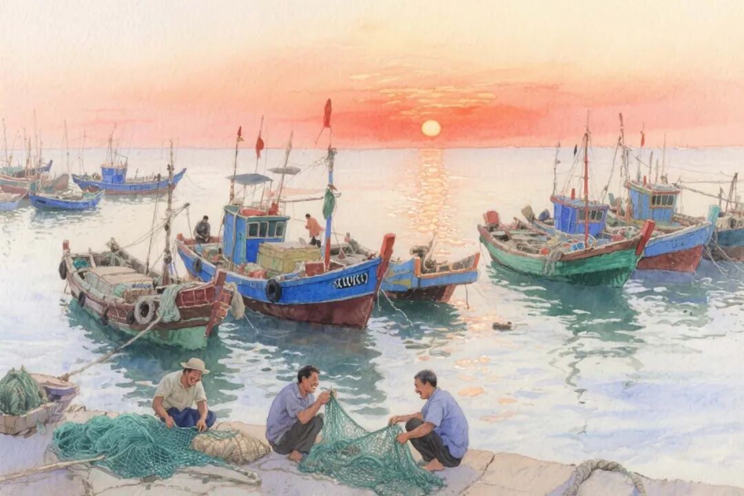作品借由渔港晚照的诗意场景,传递对和平环境的礼赞。人们能从容奔赴山海、耕耘收获,便是和平愿景最美的注脚。愿这份渔家晚韵,成为世界共赏的和平符号。