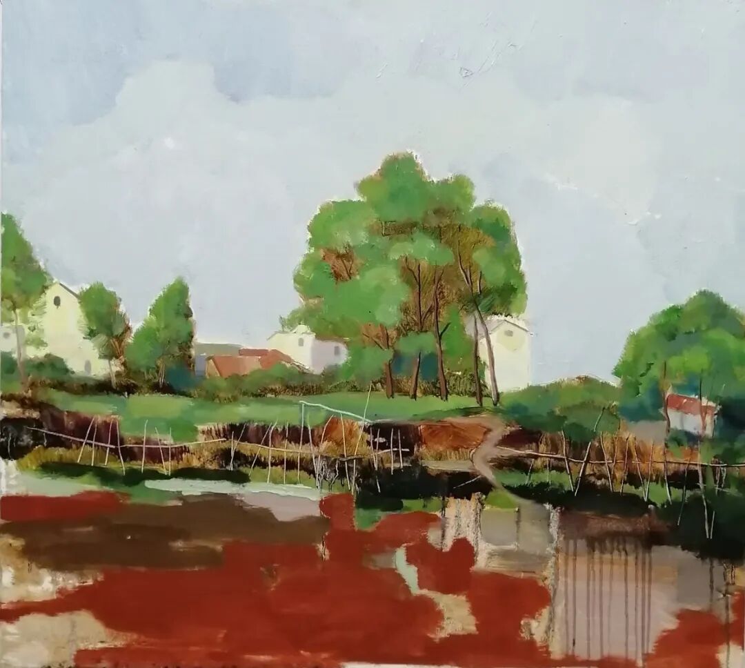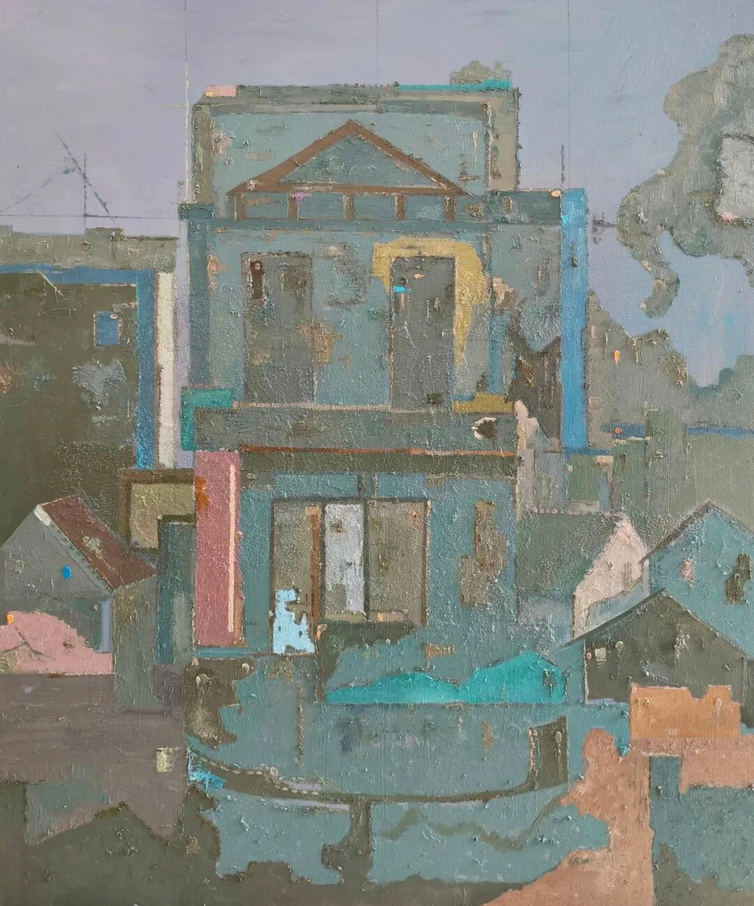 作品以斑驳笔触与多层色彩,构建建筑叠合的空间域。将记忆里的屋舍拆解、重构,不同色调与形态的建筑层叠,是时光与空间的交织。那些磨损、脱落的痕迹,似岁月蚀刻的印记,呈现出旧建筑在当下的独特存在。通过“叠” 的形式,打破常规空间秩序,让观者在斑驳色彩与建筑轮廓中,探寻城市或乡村建筑承载的往昔故事,感受时间沉淀下空间的厚重与诗意。