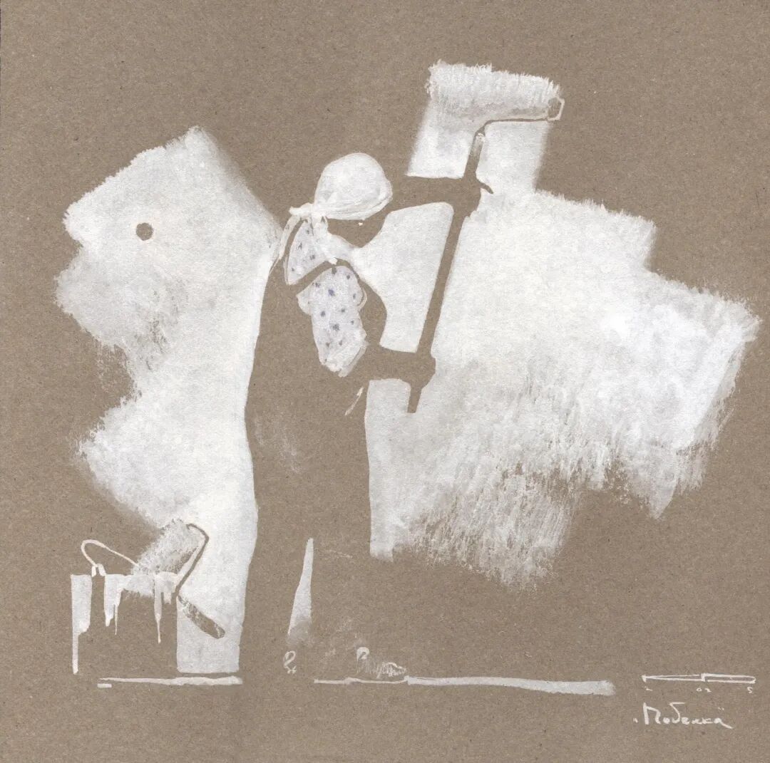 《粉刷》以极其简洁的手法呈现劳动场景:画面仅由背景与白色颜料的笔触构成,却成功塑造出一位正在工作的女粉刷匠。作品在形式上几乎是对“粉刷”一词的直译,但正因其简约,反而凸显出强烈的视觉张力。