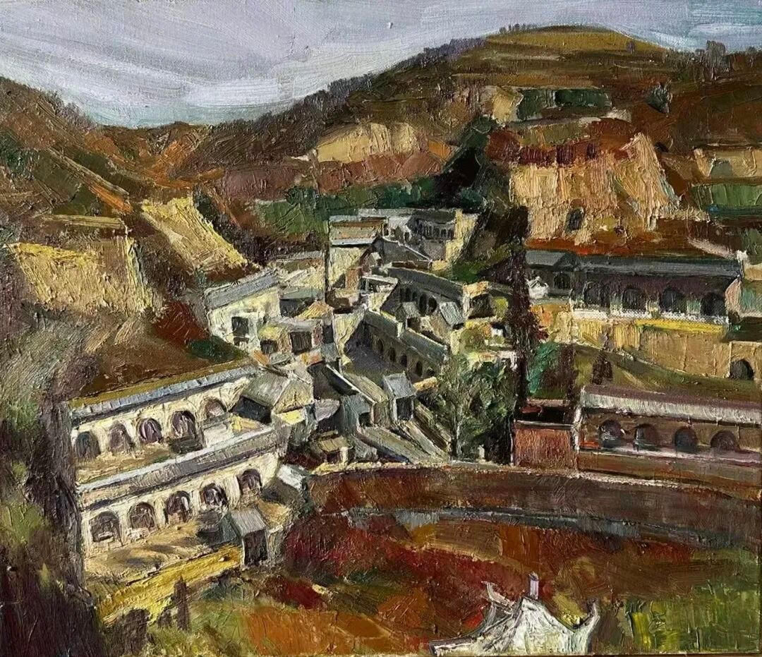 陕北郭家沟以其独特的黄土高原风貌和质朴的乡村生活成为油画创作的灵感源泉。这幅作品以厚重的笔触和温暖的色调,展现了农家场景。画面构图采用横向延展的形式,突出高原的辽阔感。同时,通过光影的明暗对比,强化山峦的立体感和农家的沧桑质感。色彩运用上,以土黄、赭石为主基调,搭配深褐与暗红,表现黄土的浑厚与岁月的痕迹,点缀以湛蓝的天空和金黄的庄稼,增添画面的生机与层次。笔触粗犷而富有肌理,既体现陕北地貌的粗粝感,又表现细腻的局部刻画。作品旨在通过艺术化的视觉语言,记录陕北特有的地理与人文风貌,传递黄土高原的坚韧精神与朴素之美,唤起观者对传统农耕文化的共鸣与思考。