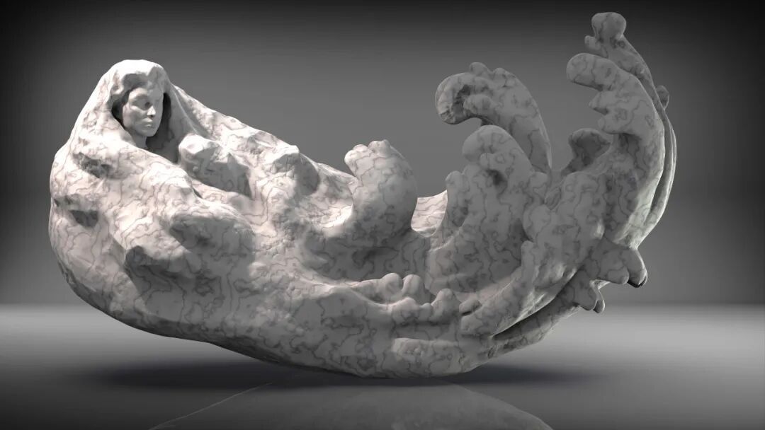 这件大理石雕塑以一位凝望远方的女性头像为主体,其发丝与奔涌的浪花完美交融,化作一道永恒定格的海浪。作品旨在通过柔美坚韧的女性形象与磅礴自然之力的结合,礼赞人类的伟大精神与对和平的永恒守望。