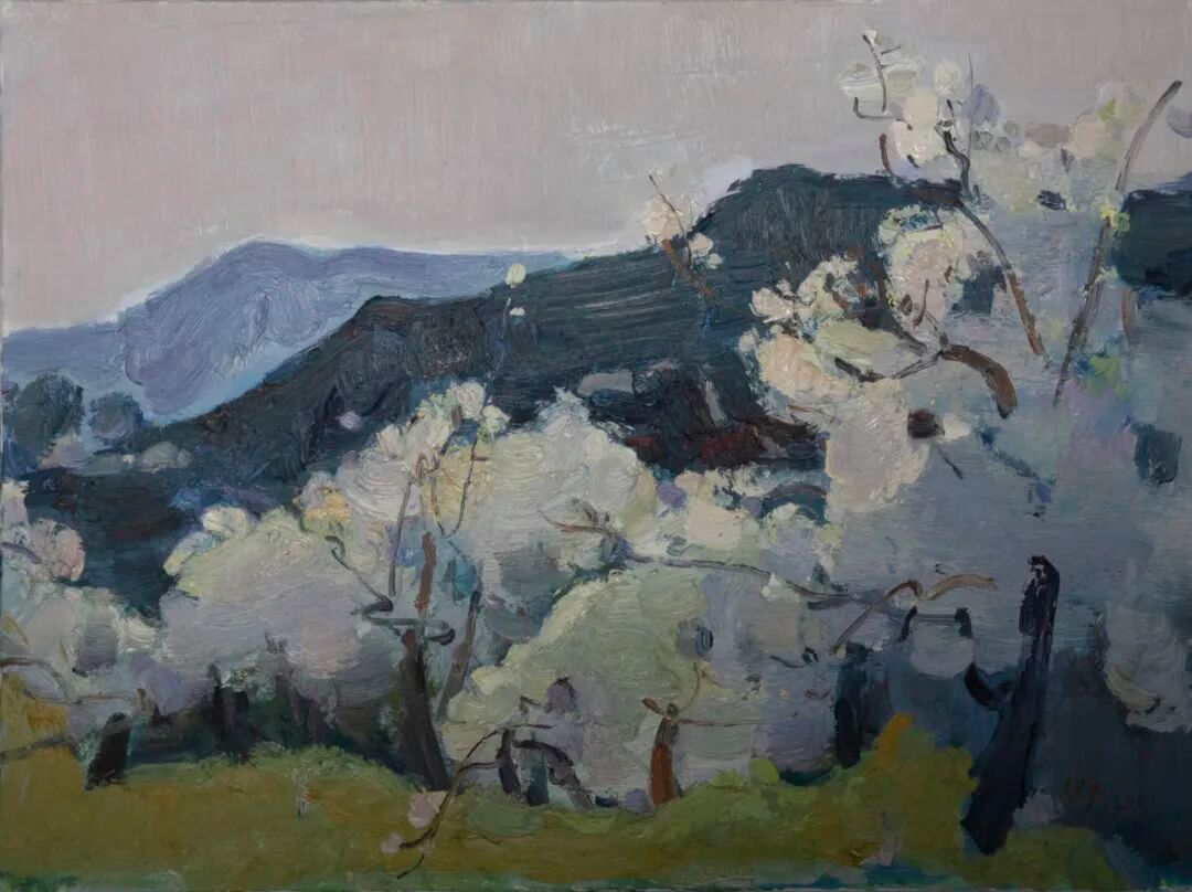 作品描绘初夏时节中国南方山峦的宁静风光。画面以刮刀技法为主,营造出厚重而坚实的视觉效果。远景中,山峦呈现微妙的淡蓝色调,朦胧而深远。中景的山体则运用蓝紫色,通过刮刀的堆叠与刮擦,形成丰富而凝重的色彩肌理,塑造出山体的体积感和沉稳气质。近景处,盛开的白色花树成为视觉焦点,其烂漫的姿态与冷色调的山峦形成鲜明对比,为画面注入生机。花树的形态同样经由刮刀塑造,色块厚实,富有表现力,而勾勒的花枝是触发的灵动生机。整体色彩关系以微蓝、蓝紫与纯净的白色相互映衬,既体现了南方山野特有的湿润空气感与纯净感,又通过刮刀赋予的强烈质感和稳定构图,传达出河山稳固、岁月静好的意境。