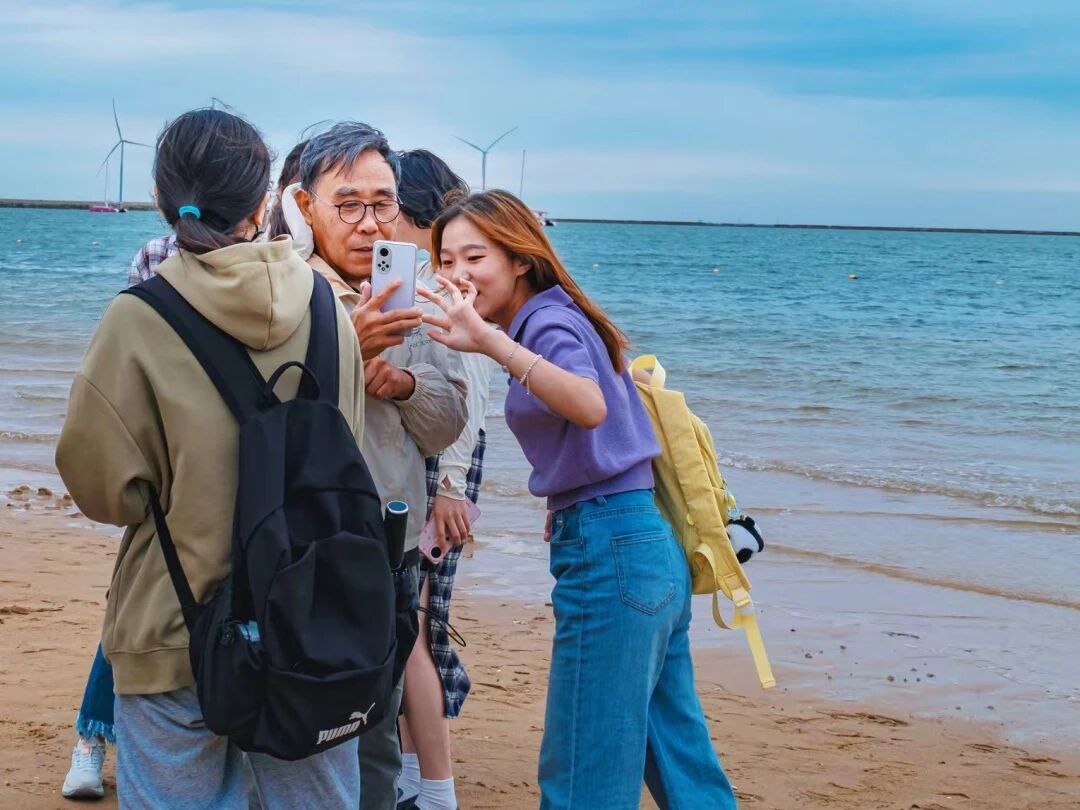 东疆湾边,海风习习。在东疆湾,曹老师引导同学们将单调的海面与四周的景物、动态的人像相结合,沙滩上的遮阳伞、拥抱大海的游客,都可以成为打破单一海景的“点睛之笔”。曹老师进一步示范,利用低角度仰拍将人物与天空融为一体。