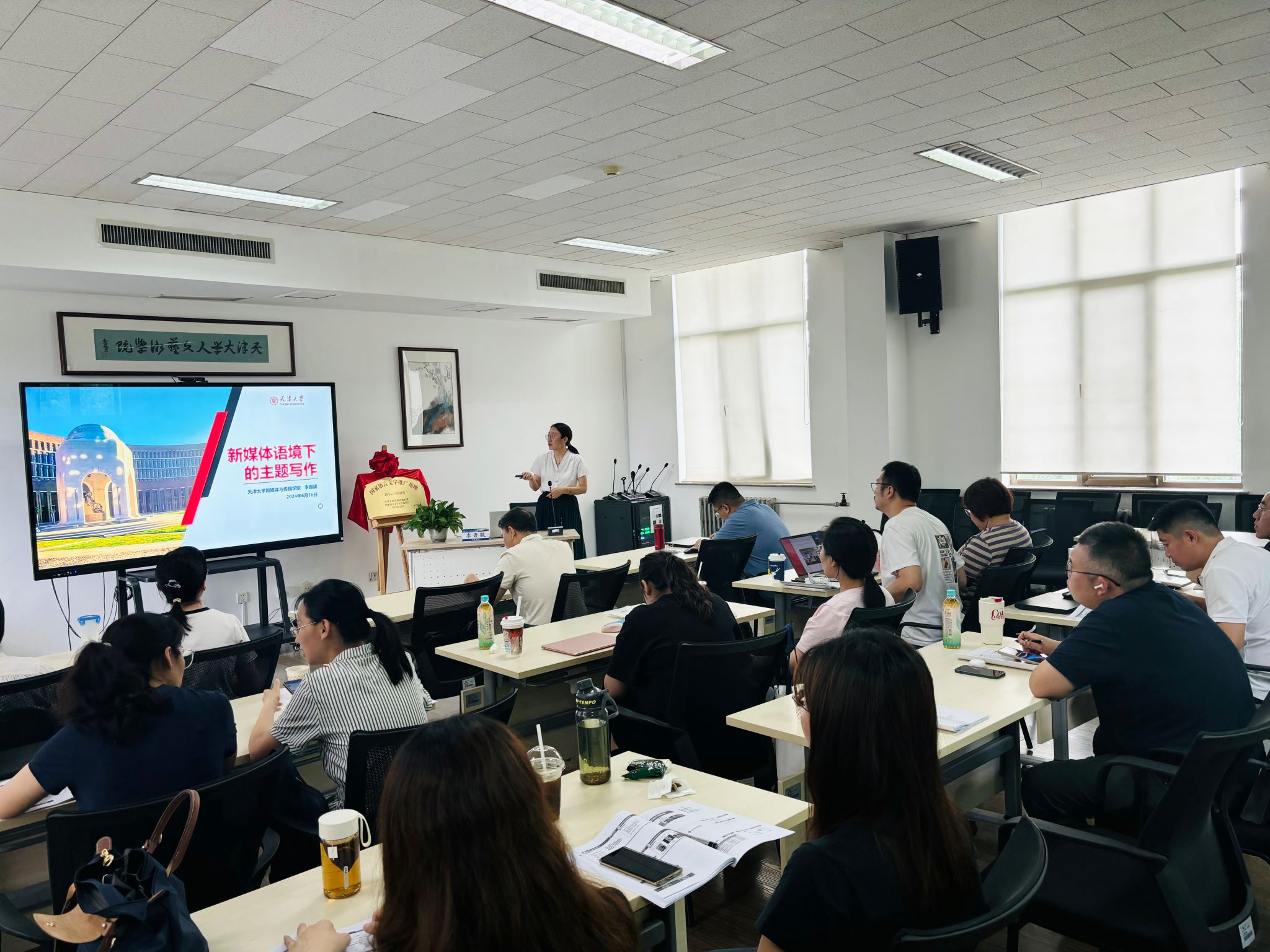 16日下午,新媒体与传播acg盒子 党委副书记、副院长李晋馥以“新媒体语境下的主题写作”为题开展培训。她带领学员了解了新媒体的发展历程,分析了新媒体环境的特点,进而讲授了如何进行新媒体语境下的主题写作。
